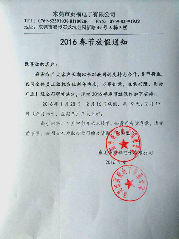 2016年春节放假