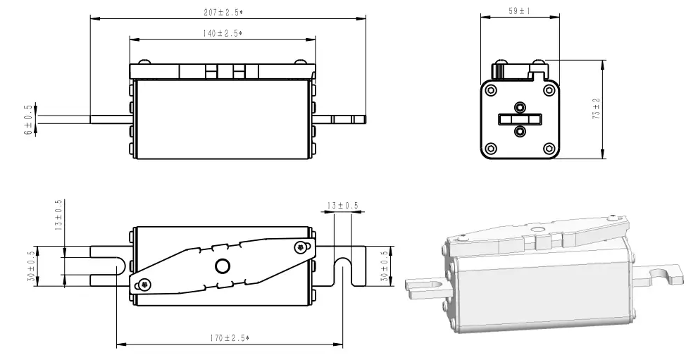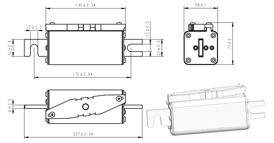| Connect | Part No. | Fuse Amps | Average @250KA/1500Vdc | Power Loss (W) | Approvals | |||